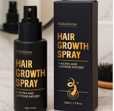 HaloGrow Haarspray ist eine topische Haarwuchslösung, die Haarausfall reduziert, die Haarfollikel stärkt und neues Haarwachstum fördert. Es verwendet eine Kombination aus Biotin, Koffein, Kräuterextrakten und Vitaminen, um die Kopfhaut zu pflegen und ruhende Haarwurzeln zu stimulieren.
