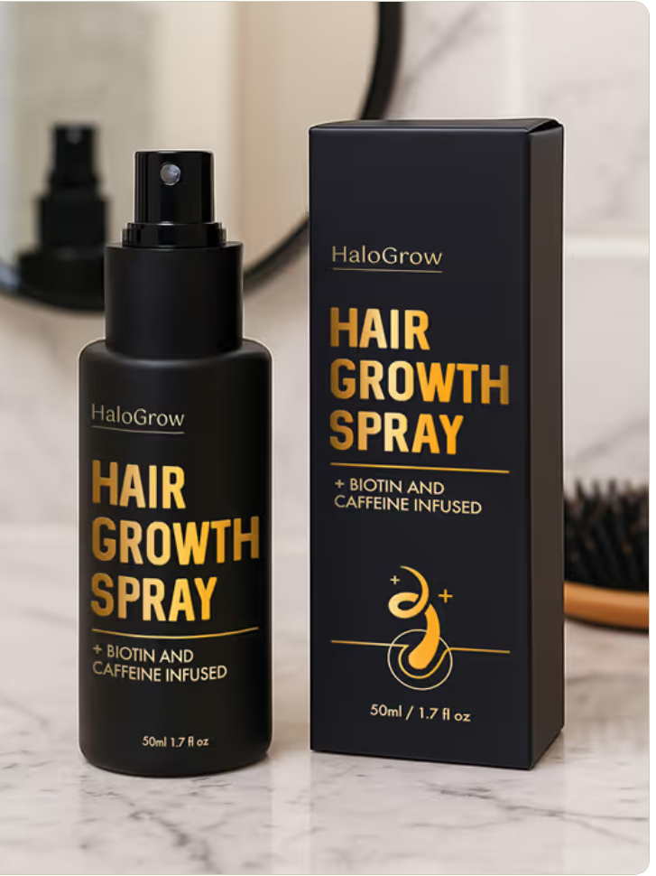 HaloGrow Hair Spray ist ein Leave-in-Kopfhaut- und Haarwuchsspray, das entwickelt wurde, um dünner werdendes oder strapaziertes Haar bei Männern und Frauen zu unterstützen.